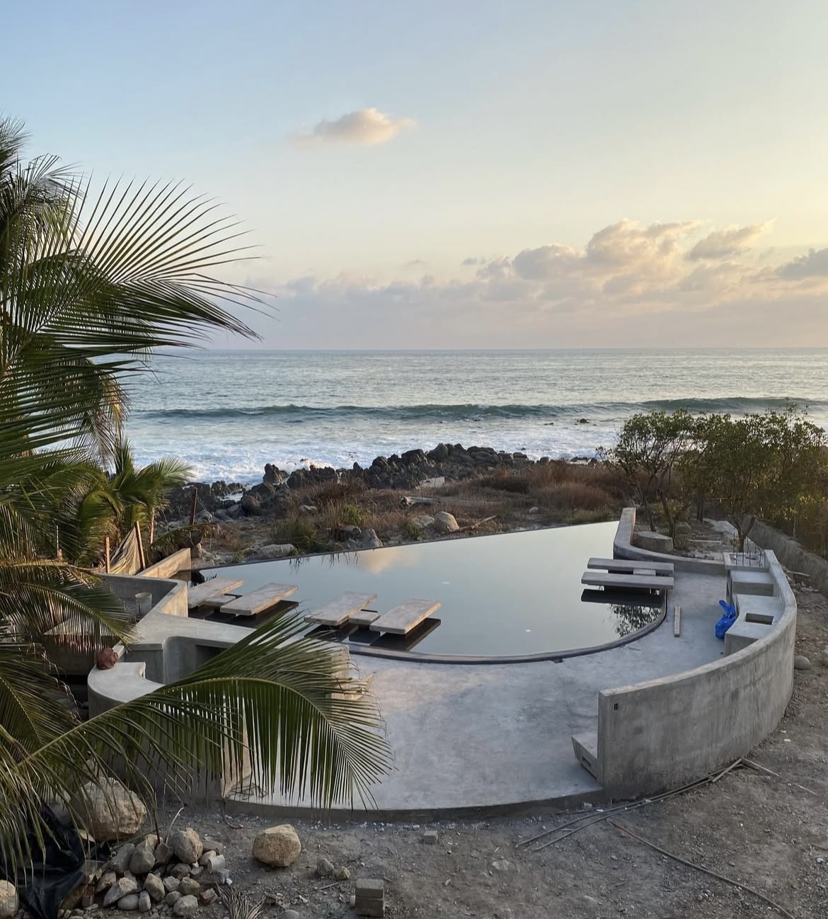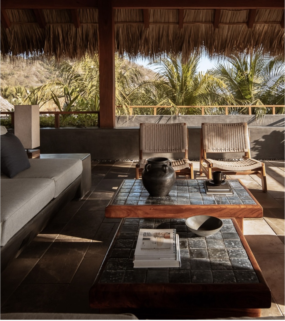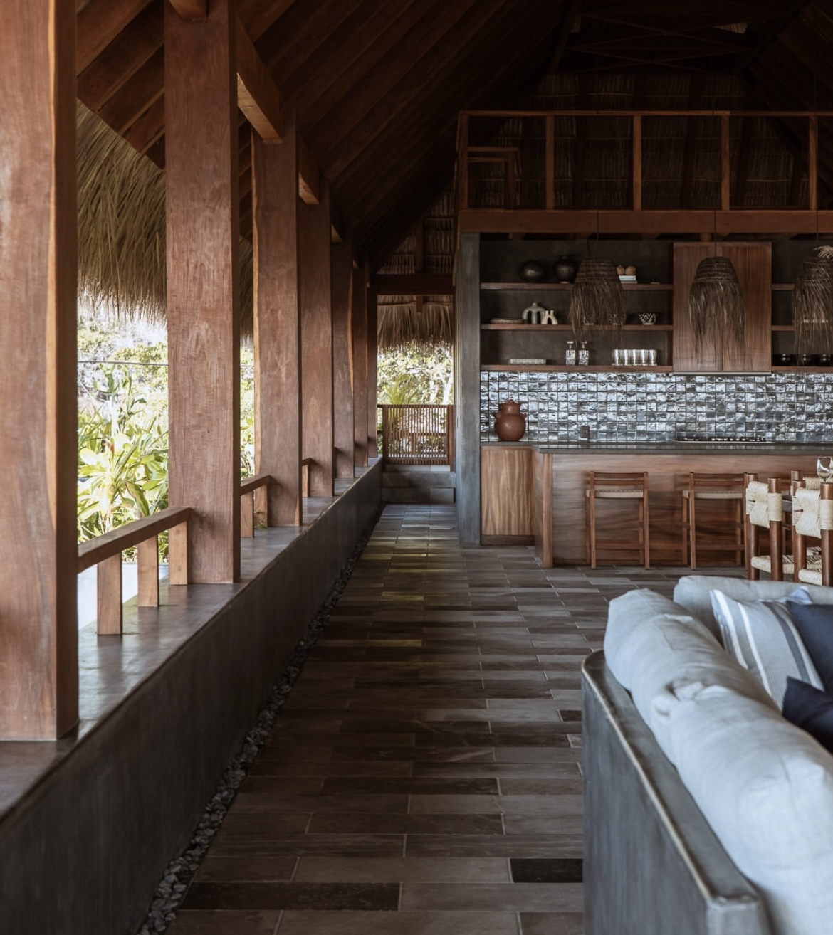 La palapa elevada no es un gesto decorativo, sino un mirador que se funde con el paisaje y restituye la escala al mar, al cielo, al viento. En lugar de contener, la casa acompaña: su forma curva guía, su sombra protege, su porosidad invita a aves, mariposas y cangrejos a cohabitar el espacio.
