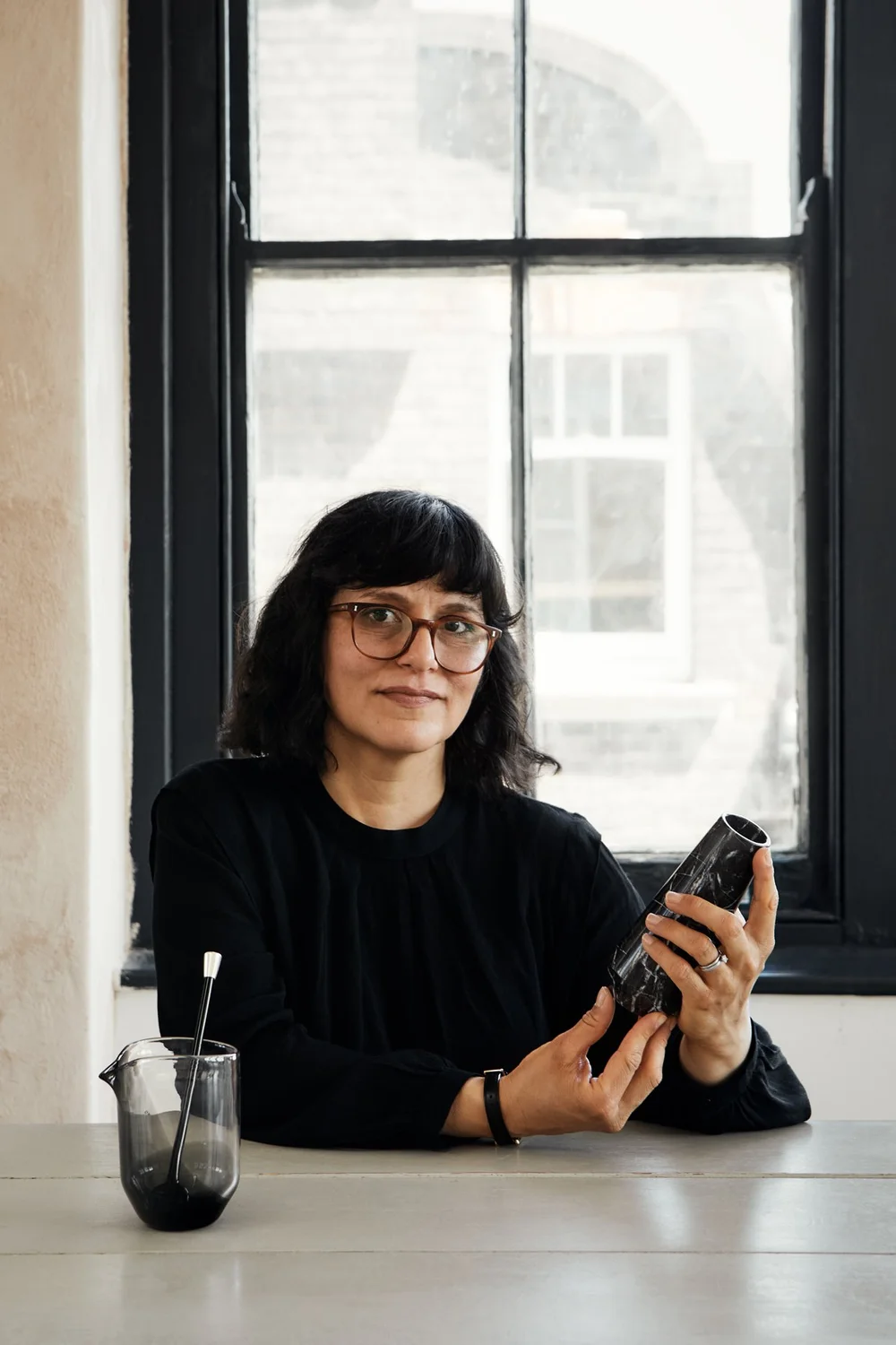 Esta atención a la narrativa colaborativa aparece también en Encuentros, un set de bar de edición limitada comisionado por Maestro Dobel dentro de la plataforma Creating Brilliance, curada por Revolution of Forms. El proyecto articula vidrio soplado, mármol negro del sur y referencias formales a la coa del jimador, conectando el proceso del tequila con oficios especializados. Cada material cuenta una parte de la historia: el horno, la piedra, el gesto agrícola. La narrativa no se añade al objeto; emerge de su fabricación.