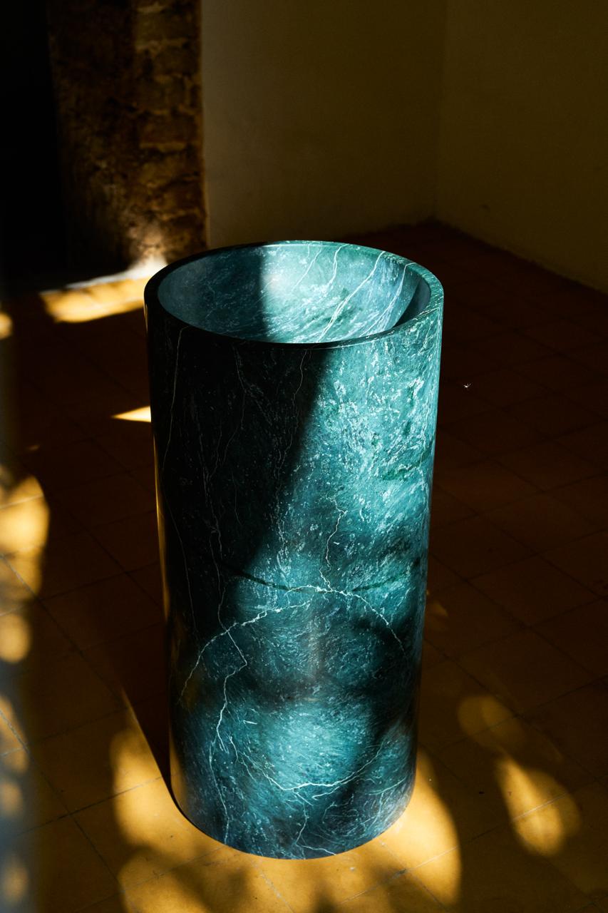 Tallarlo todo desde un solo bloque -lavamanos, tinas, accesorios- resulta, desde luego, más caro, más lento y más complejo. Pero también es la única manera de mantener una honestidad estructural. No hay uniones que ocultar ni un “lado de atrás” donde esconder costuras. Esa transparencia es parte del detalle.