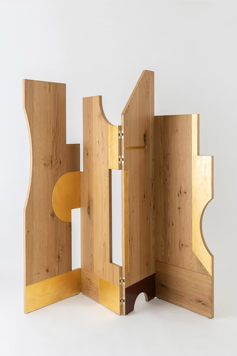 Un biombo de roble con acentos en hoja de oro de 24 quilates que oscila entre lo ritual y lo estructural. La geometría, casi musical, marca pausas y aperturas. El oro, lejos de ser ornamento, señala lo sagrado del límite.
