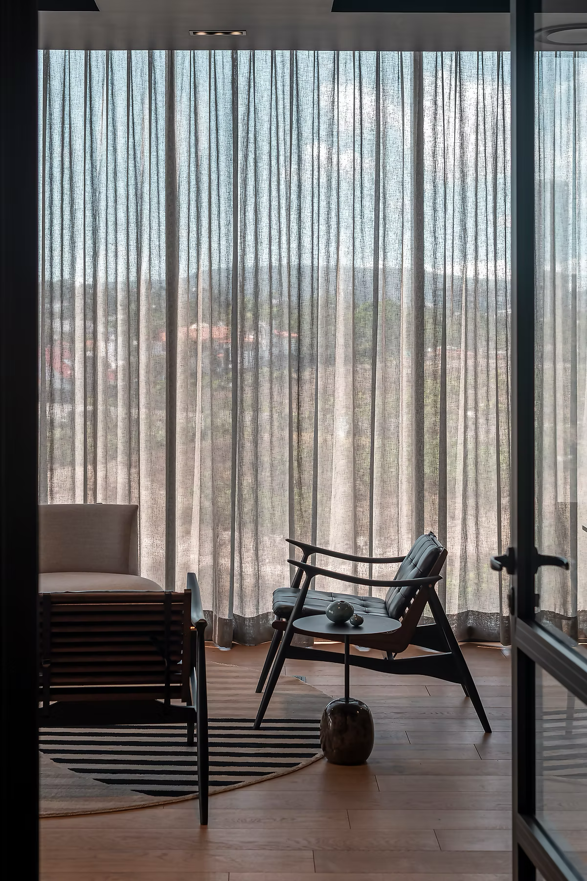 Estudio K V curó el interiorismo con una mirada editorial, eligiendo piezas artesanales y mobiliario a medida que actúan como acentos de una arquitectura que no necesita alardes. La relación con la naturaleza es discreta pero constante: la barranca circundante se filtra en texturas, reflejos, brisas. Todo está calculado para no interrumpir el pulso íntimo de quien habita.