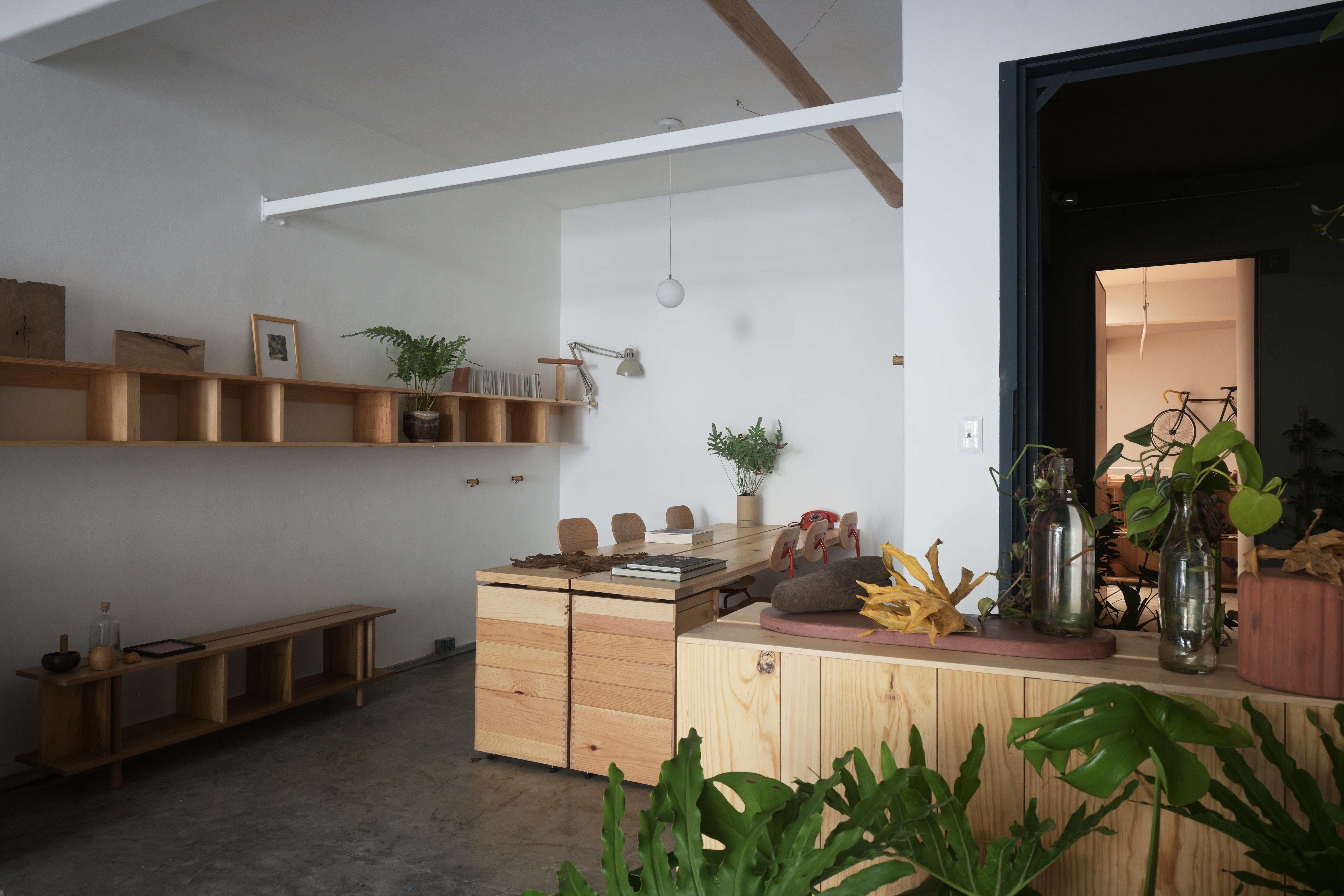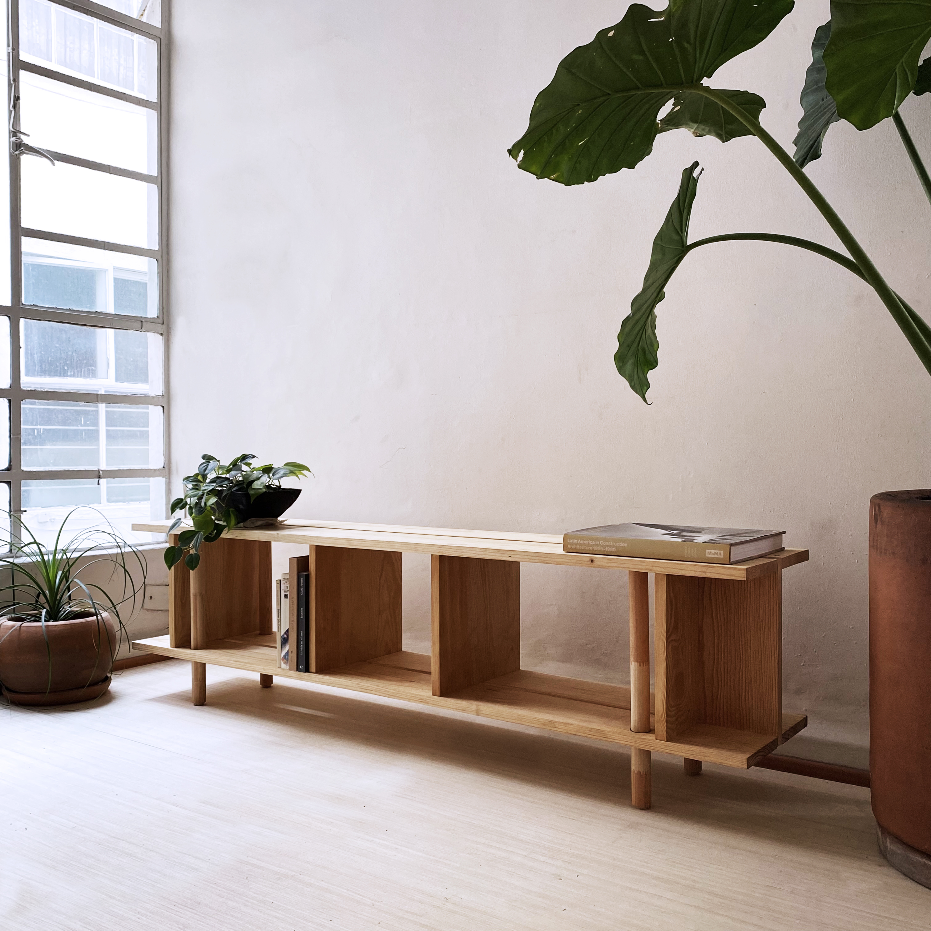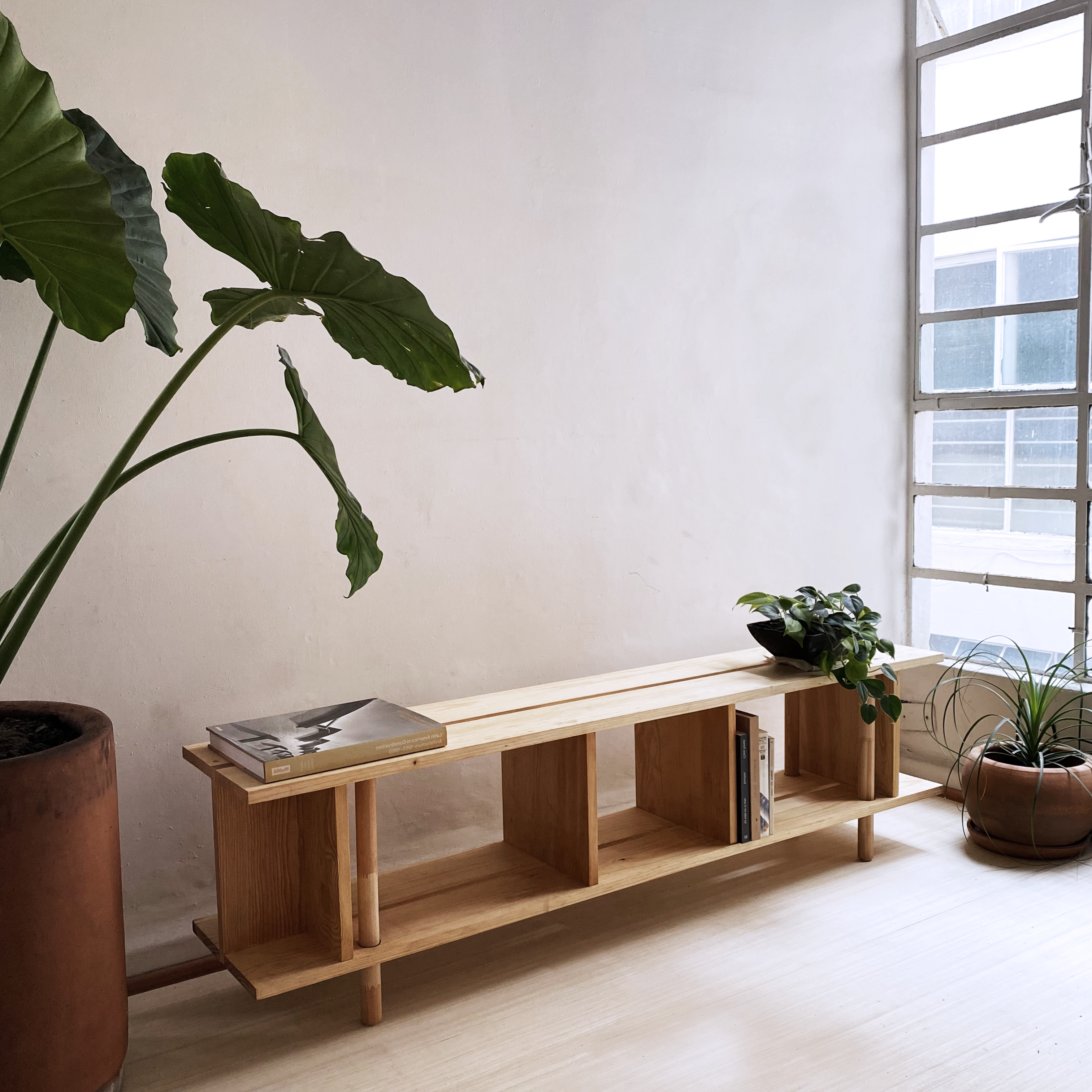 Esa filosofía se materializa en piezas como Tule, una consola ligera que parece una viga suspendida. “No hubo plano. La construimos con lo que había, tratando de no desperdiciar nada”, recuerda Pacheco. “Queríamos que fuera fácil de transportar, sin tornillos, sin herrajes innecesarios. Que cualquiera pudiera ensamblarla.” El resultado es un objeto directo, que no esconde sus uniones ni disfraza su estructura.