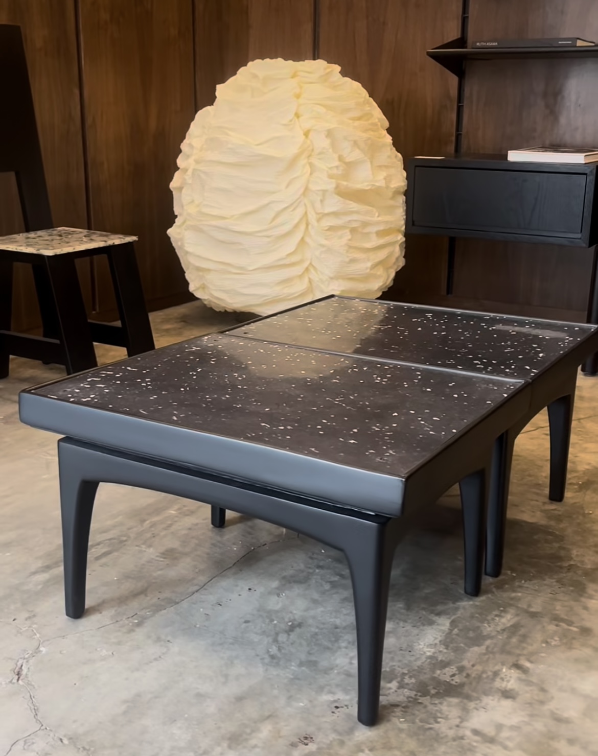 La colaboración con Truvé, reconocida marca de mobiliario vintage, amplía el alcance de esta exploración. “Nos encanta Truvé, consideramos que es probablemente la mejor marca de muebles vintage de la ciudad”, afirma Collado. “Intervenimos algunas de sus piezas con paneles de plástico reciclado. Parecen granitos, pero al final es plástico. Es una readaptación de este tipo de mobiliario por Irrelevante”.